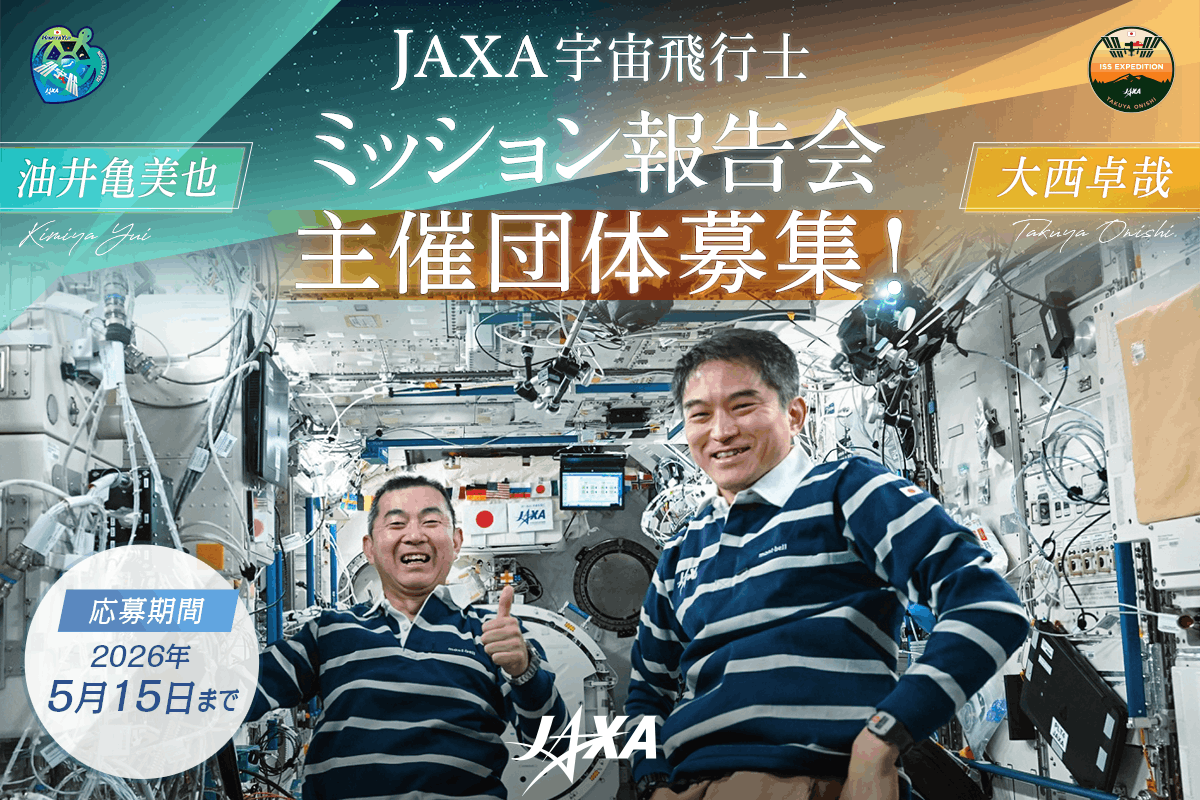 この度、これに加えて、全国各地での開催を通じて、より多くの方々に直接お話しする機会を設けることを目的に、JAXA宇宙飛行士・油井亀美也および大西卓哉のミッション報告会を、主催者として準備・企画・運営いただける「自治体/学校/企業/一般団体」等を募集いたします。